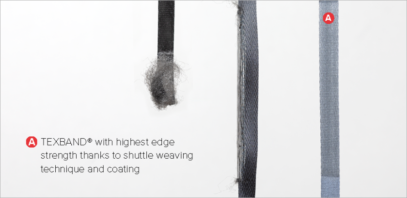 Edge strength is a decisive factor for a long service life. Thanks to the shuttle weaving technique, the edges of the tape are absolutely uniform and highly resistant to abrasion.
